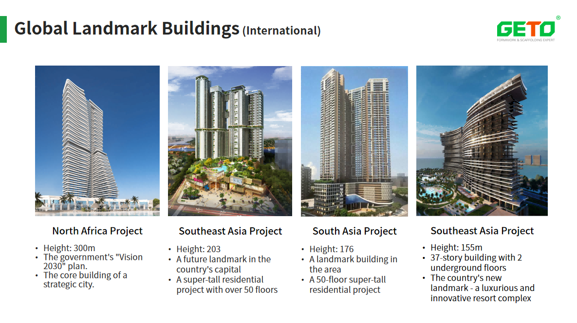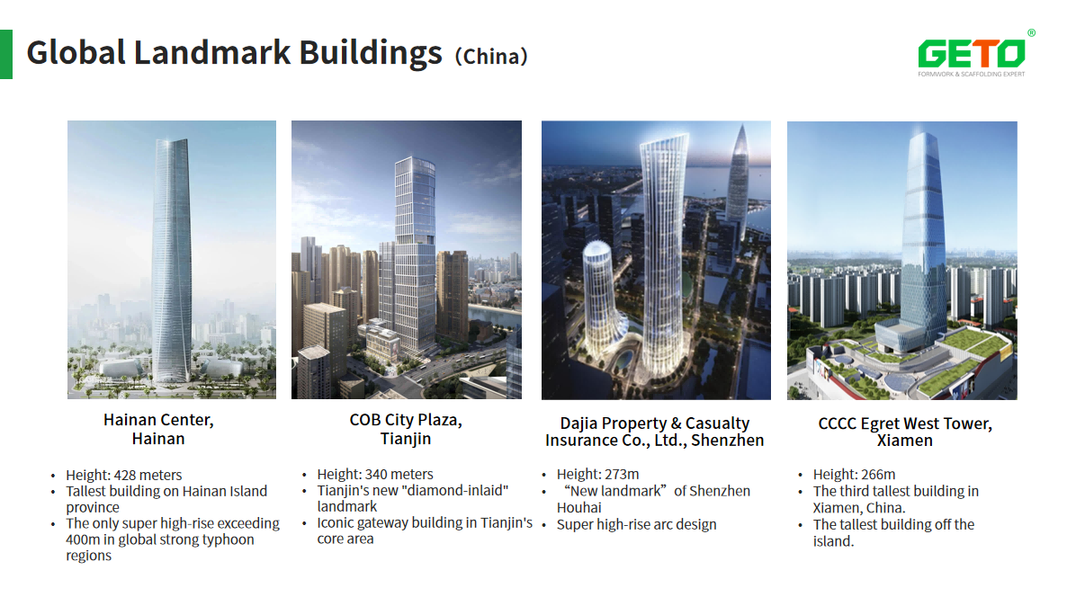 Знаменитые здания: международные проекты в Северной Африке, Юго-Восточной Азии и Южной Азии решают задачи строительства сверхвысотных зданий и адаптируются к потребностям развития основных рыночных зон. Знаменитые небоскребы, такие как Hainan Center, Tianjin City Plaza и штаб-квартира страховой компании Shenzhen Dajia, продолжают вносить свой вклад в обновление городских горизонтов Китая.