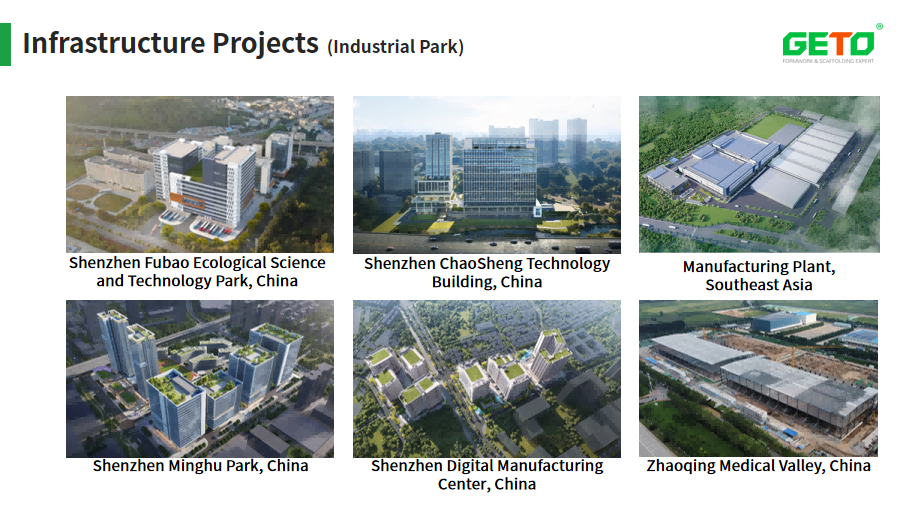 Промышленные парки: завод в Юго-Восточной Азии, экологический технологический парк Shenzhen Shenfubao, технологический парк Shenzhen Chaoshen Jianshuo, интеллектуальная долина Shenzhen Minghu, цифровой производственный центр Shenzhen, медицинская долина Zhaoqing в Китае (крупные заводы с быстрым строительством, сочетающие стандартизацию и изготовление на заказ), отвечающие требованиям высокой эффективности и точности строительства современных промышленных объектов.