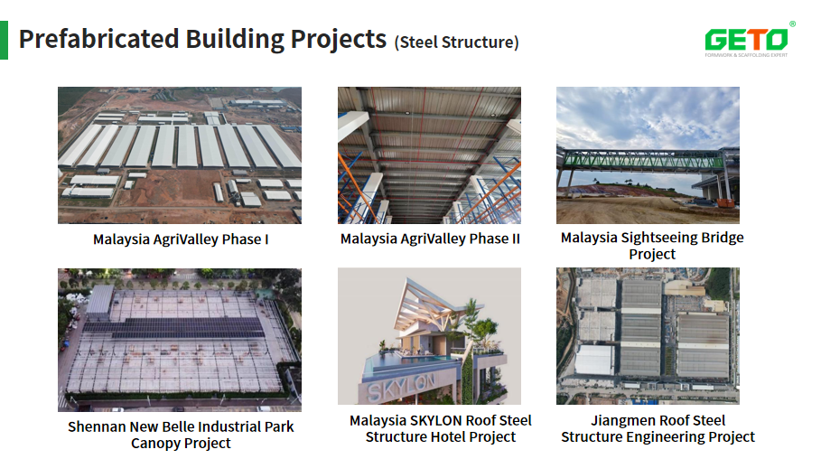 - Проект молочной фермы в Малайзии (крупное сельскохозяйственное предприятие), проект отеля с кровельной стальной конструкцией SKYLON в Малайзии (крыша нестандартной формы), демонстрирующий возможности GETO в проектировании и строительстве большепролетных стальных конструкций.