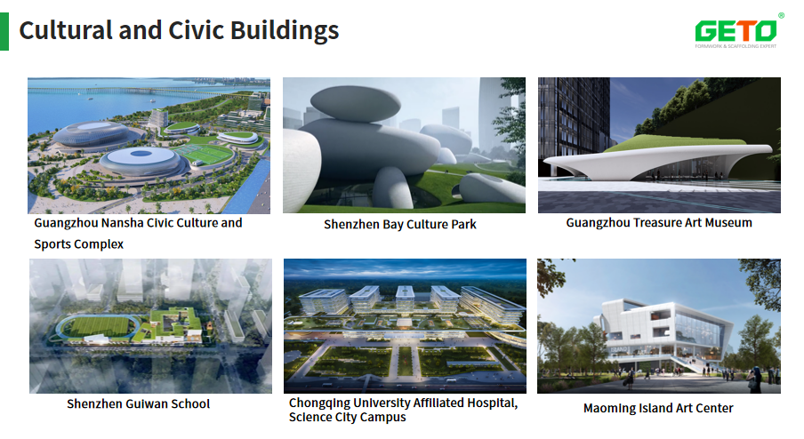 Общественные здания: Гражданский культурно-спортивный комплекс «Наньша» в Гуанчжоу (крупномасштабное сооружение), Культурная площадь залива Шэньчжэнь (нестандартное культурное пространство), Художественный музей Чжэньбао в Гуанчжоу (точность в художественном пространстве), Школа Гуйвань в Шэньчжэне (образовательная инфраструктура), Научный городок при больнице Чунцинского университета (сложная медицинская архитектура) и Художественный центр острова Маомин (особая прибрежная среда) в Китае. Эти проекты демонстрируют высокие стандарты и сложные требования к строительству, предъявляемые к предоставлению точных услуг для разнообразной общественной инфраструктуры.